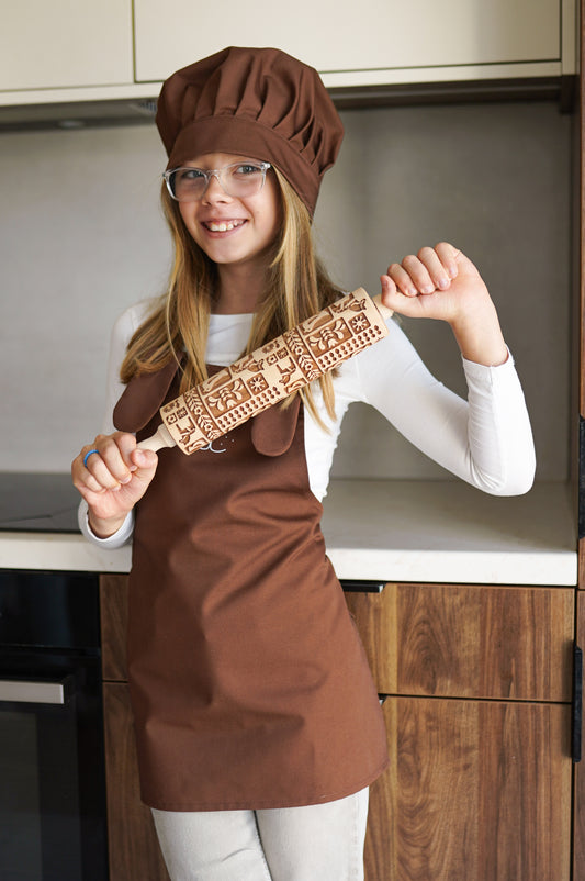 ZESTAW FARTUSZEK I CZAPKA brąz z aplikacją
