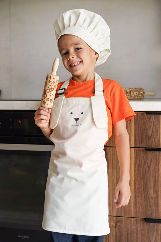 ZESTAW FARTUSZEK I CZAPKA ecru z aplikacją